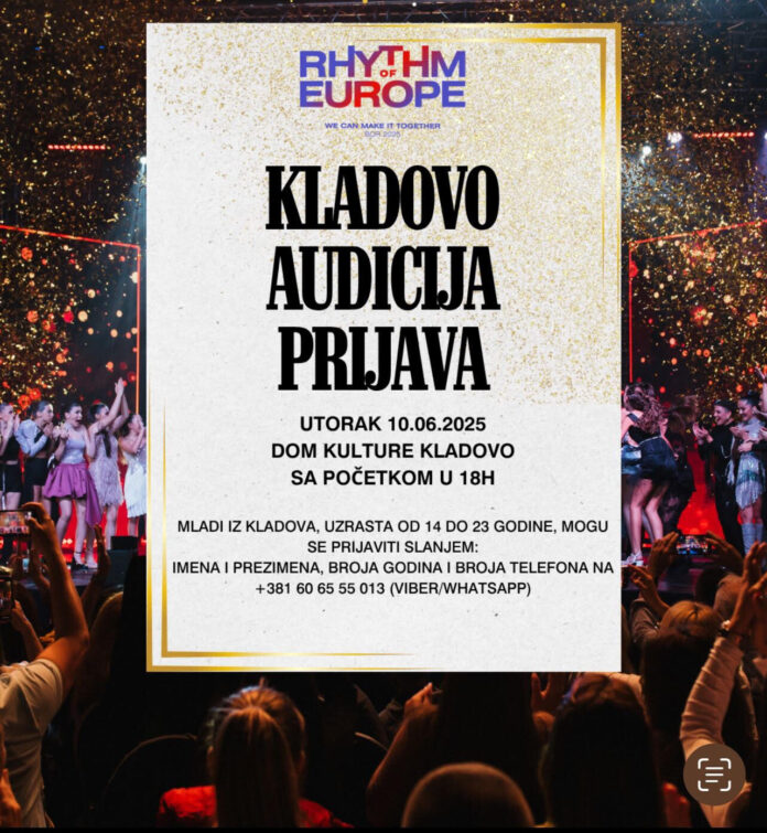 Na sastanku održanom u Kladovu dogovoreno je da audicija za festival „Srbija Ritam Evrope“ za talentovane takmičare iz naše opštine uzrsta od 14 do 23 godine bude u utorak 10. juna u 18 časova u Domu kulture. Na audiciji mogu da se pojave mladi iz gradske i seoskih sredina.