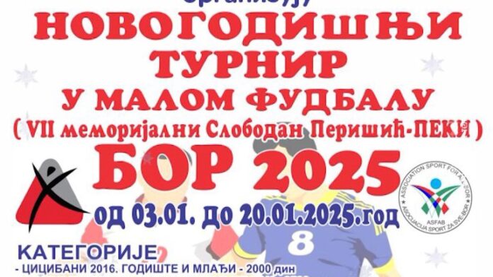 Sedmi memorijalni novogodišnji turnir u malom fudbalu „Slobodan Perišić Peki“ u Boru i ove godine će, od 3. do 20. januara biti održan u Sportskom centru „Bobana Momčilović Veličković“ u Boru. Grad Bor je ove godine izdvojio 270.000 dinara za organizaciju turnira, kao i majice za sve ekipe, dok su za sve takmičare obezbeđene su robne nagrade.