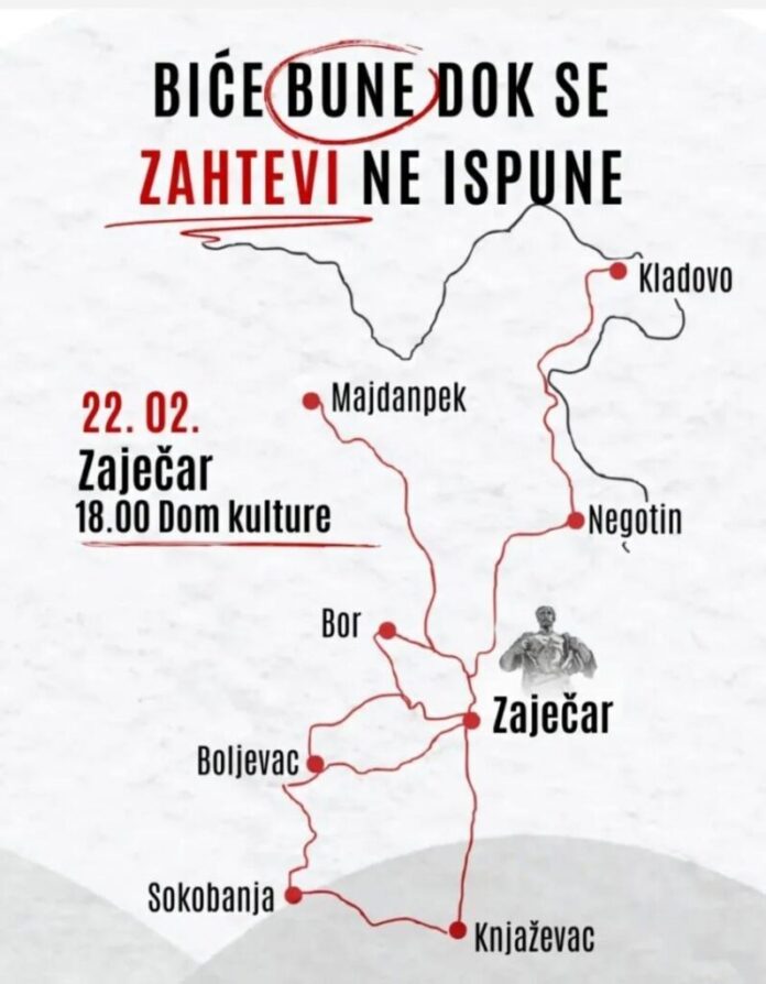 Kako TV Kladovo saznake u subotu 22. februara u 18 sati ispred Doma kulture u Kotlujevcu na zajedničkom skupu u Zaječaru pod sloganom “Biće bune dok se zahtevi ne ispune” okupiće se studenti i građani iz Bora, Negotina, Majdanpeka, Kladova, Boljevca, Knjaževca, Sokobanje i grada domaćina.